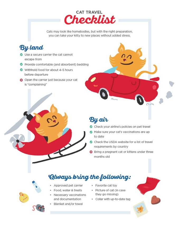 If you intend to travel by plane with your cat then you need to plan well ahead. Each airline has its own requirements and restrictions for traveling with your pet. Many airlines now allow cats to travel in the airline cabin under the seat in front of you so make sure to check the dimensions of this space before you fly. Soft sided carriers can work well for this location. A trip to the veterinarian may also be needed before you fly if vaccination records or a health certificate is required. Most cats do travel well but it is not recommended to send a pregnant cat or kittens under three months old.